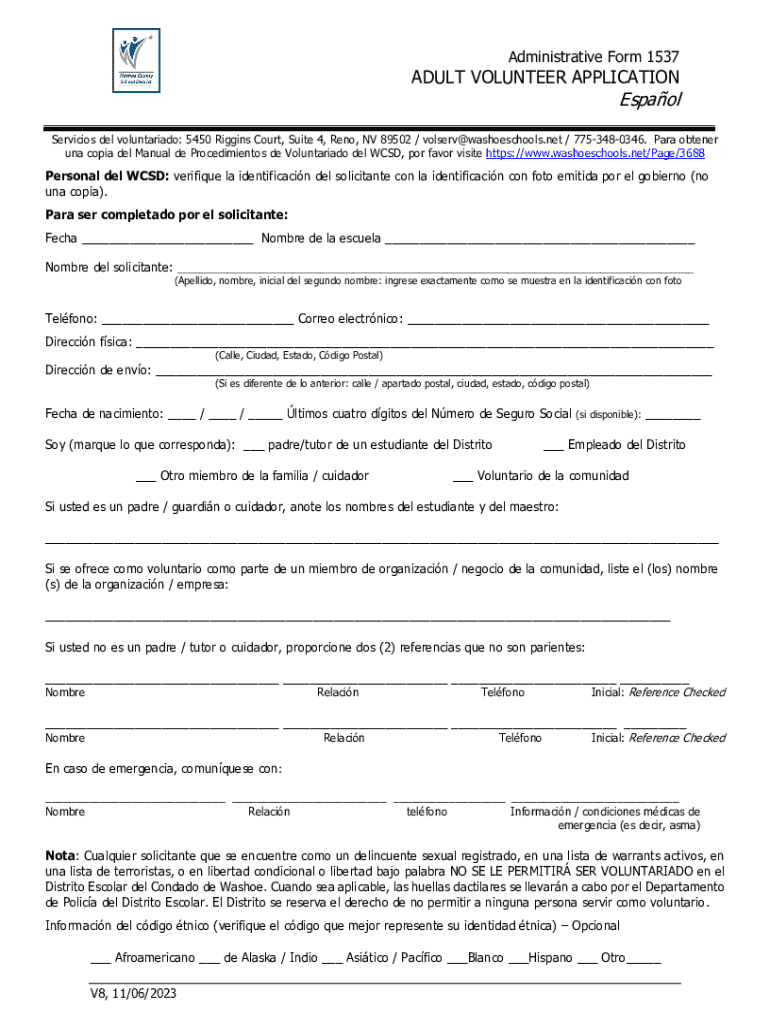 Administrative Form 1537ADULT VOLUNTEER APPLICATIONEspaolServicios Del voluntarily: 5450 Higgins Court, Suite 4, Reno, NV 89502 / volserv@washoeschools.net / 7753480346. Para oftener