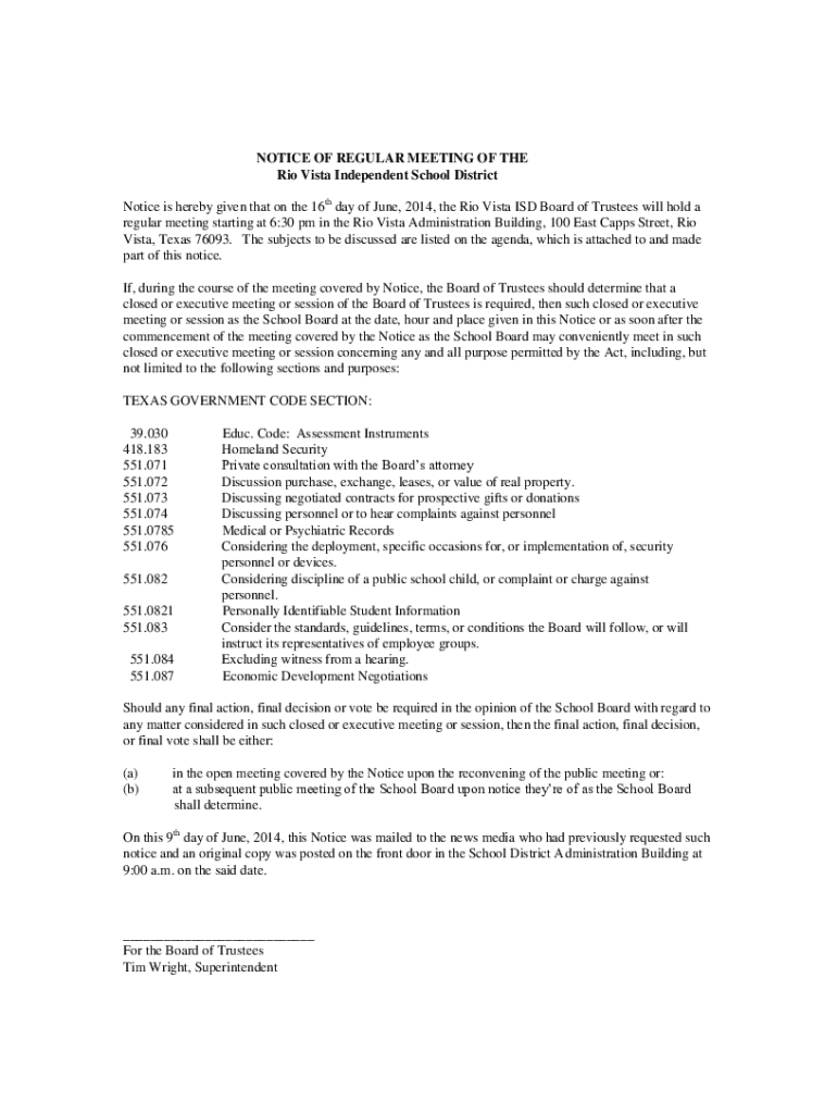 Get the free Notice is hereby given that on the 16th day of June, 2014, the Rio Vista ISD Board o...
