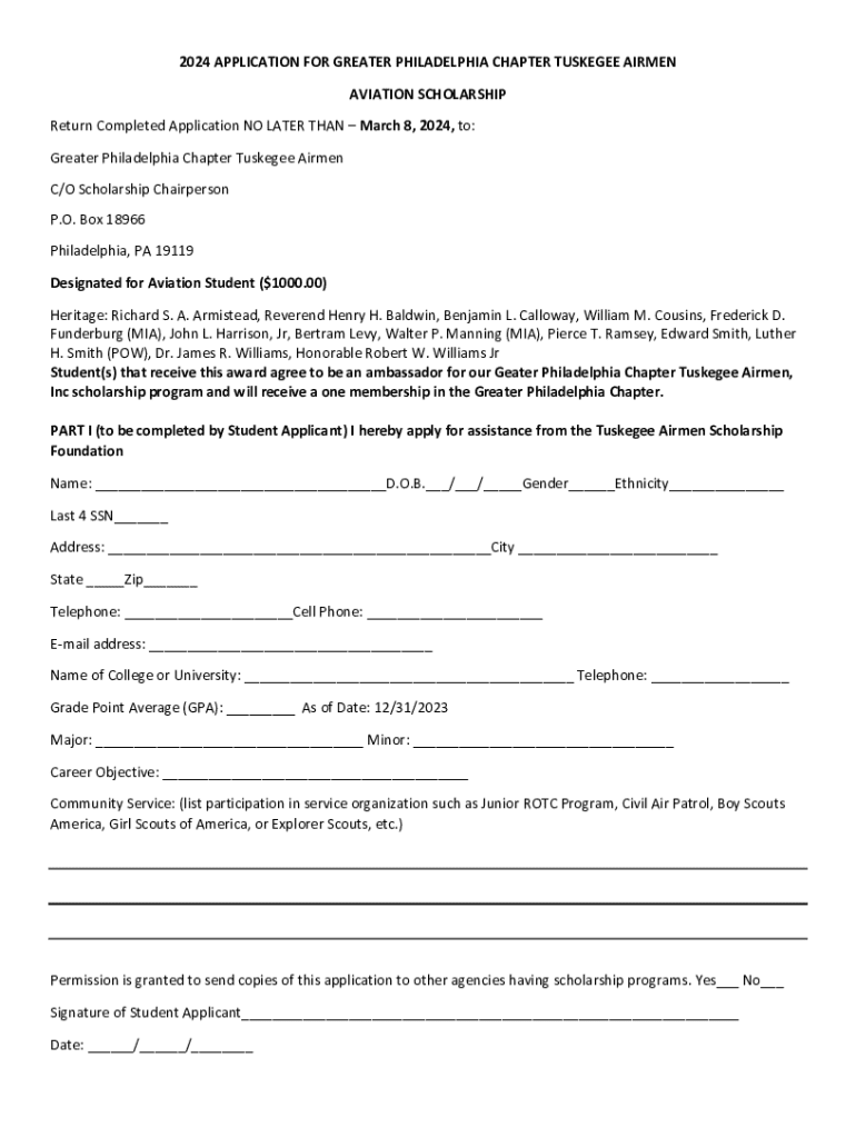 2024 APPLICATION FOR GREATER PHILADELPHIA CHAPTER TUSKEGEE AIRMEN AVIATION SCHOLARSHIP Return Completed Application NO LATER THAN March 8, 2024, to: Greater Philadelphia Chapter Tuskegee Airmen C/O