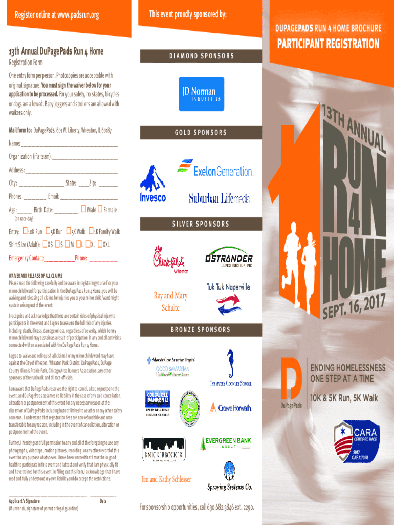 This event proudly sponsored by:Register online at www.padsrun.orgDUPAGEPADS RUN 4 HOME BROCHUREPARTICIPANT REGISTRATION13th Annual DuPagePads Run 4 HomeDIAMOND SPONSORSRegistration Form One entry