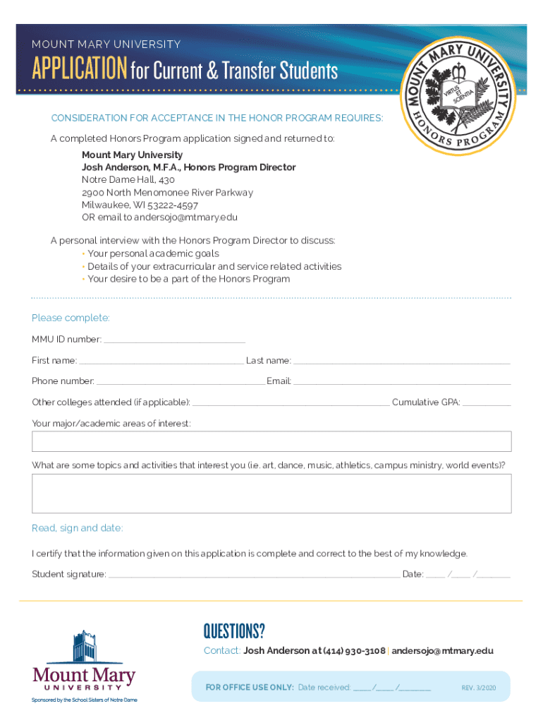 MOUNT MARY UNIVERSITYAPPLICATION for Current & Transfer Students CONSIDERATION FOR ACCEPTANCE IN THE HONOR PROGRAM REQUIRES: A completed Honors Program application signed and returned to: Mount Mary