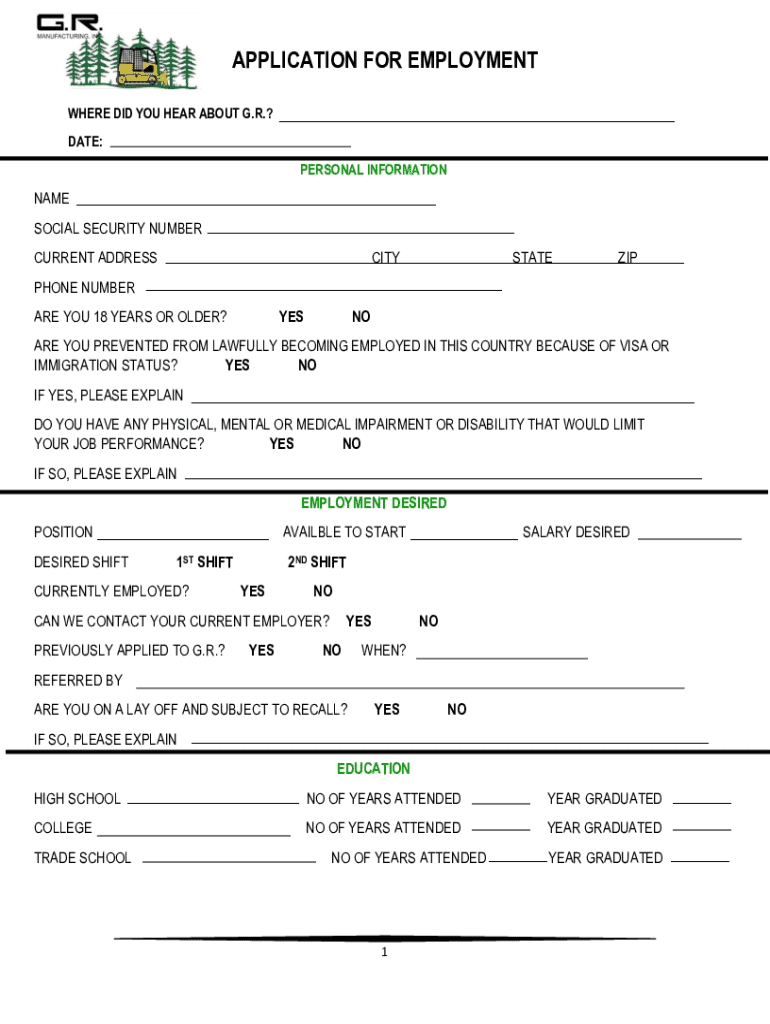 APPLICATION FOR EMPLOYMENT WHERE DID YOU HEAR ABOUT G.R.? DATE: PERSONAL INFORMATIONNAME SOCIAL SECURITY NUMBER CURRENT ADDRESSCITYSTATEZIPPHONE NUMBER ARE YOU 18 YEARS OR OLDER?YESNOARE YOU PREVENTED