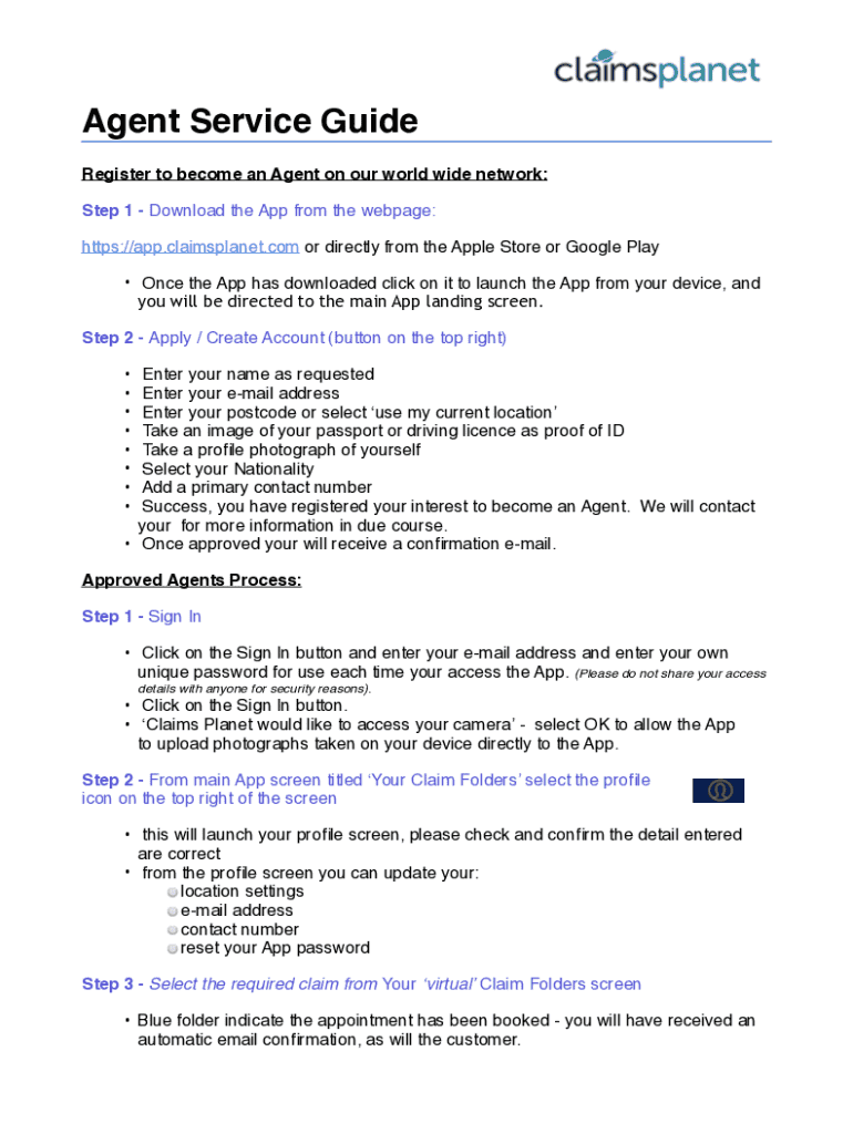 Agent Service Guide Register to become an Agent on our worldwide network: Step 1 Download the App from the webpage: https://app.claimsplanet.com or directly from the Apple Store or Google Play Once