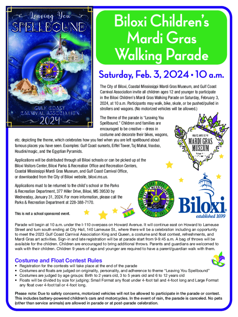 Biloxi Childrens Mardi Gras Walking Parade Saturday, Feb. 3, 2024 10 a.m. The City of Biloxi, Coastal Mississippi Mardi Gras Museum, and Gulf Coast Carnival Association invite all children ages 12