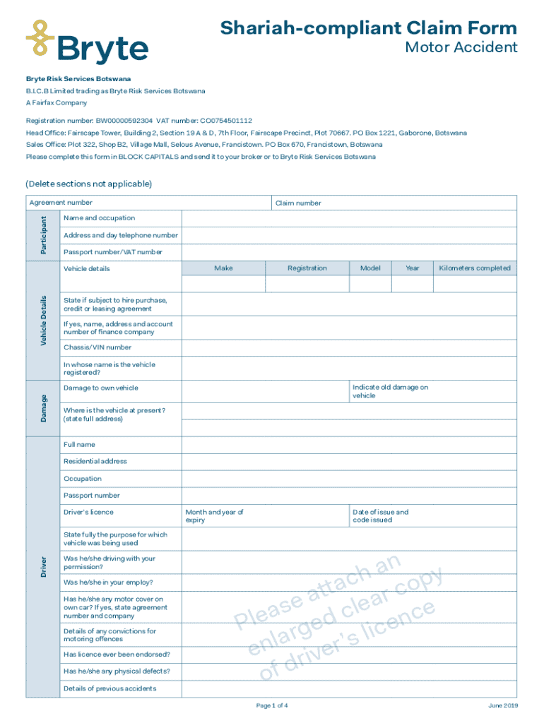 Shariah compliant Claim Form Motor AccidentBryte Risk Services Botswana B.I.C.B Limited trading as Byte Risk Services Botswana A Fairfax Company Registration number: BW00000592304 VAT number: CO0754501112