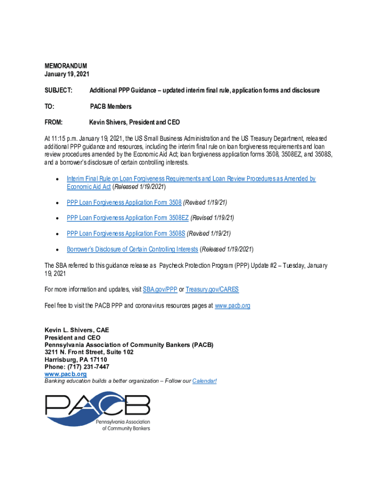 SUBJECT:Additional PPP Guidance updated interim final rule, application forms and disclosure TO:PACE MembersFROM:Kevin Shivers, President and Coat 11:15 p.m. January 19,