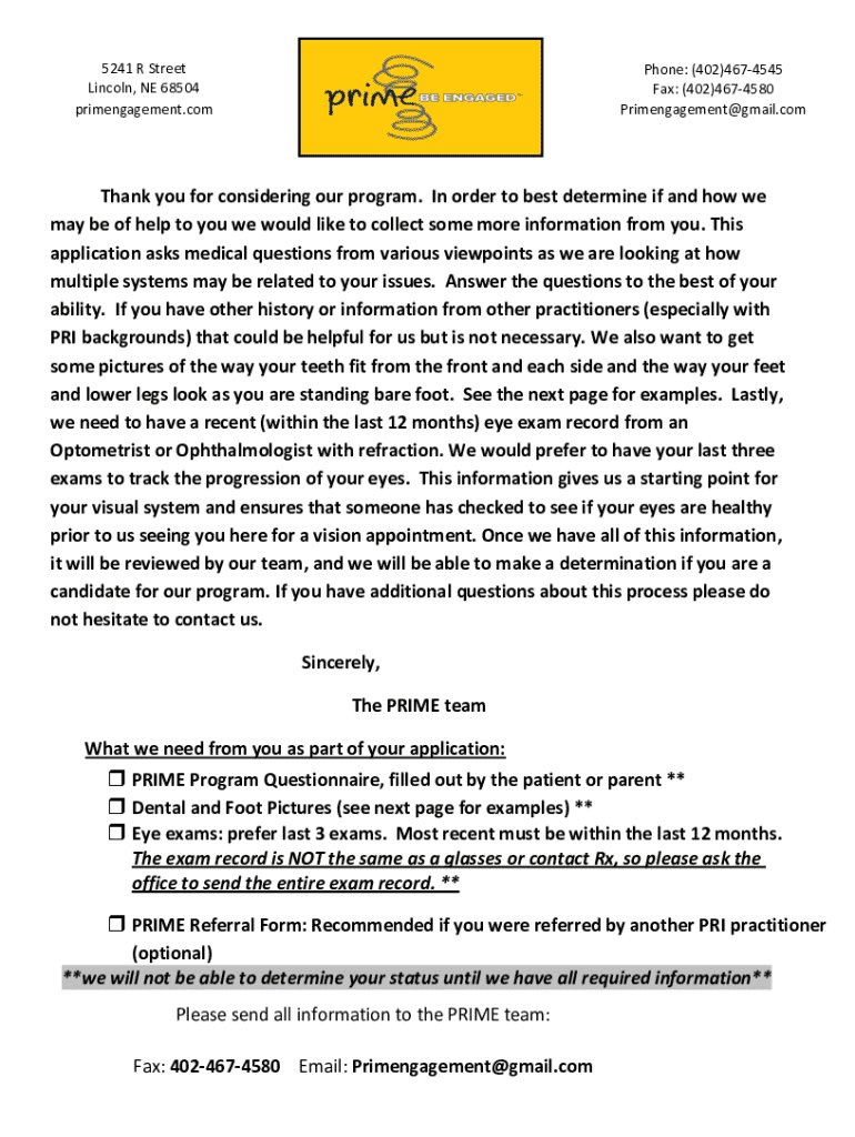 5241 R Street Lincoln, NE 68504 primengagement.comPhone: (402)4674545 Fax: (402)4674580 Primengagement@gmail.comThank you for considering our program. In order to best determine if and how we may