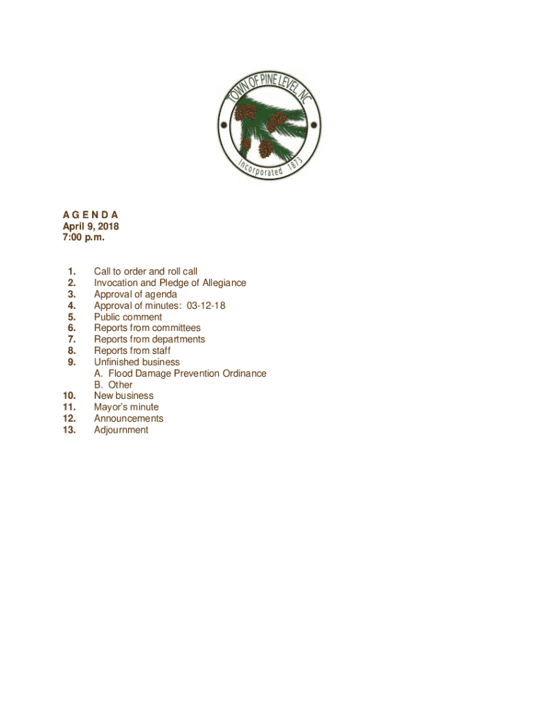 AGENDA April 9, 2018 7:00 p.m.1. 2. 3. 4. 5. 6. 7. 8. 9.10. 11. 12. 13.Call to order and roll call Invocation and Pledge of Allegiance Approval of agenda Approval of minutes: 031218 Public comment