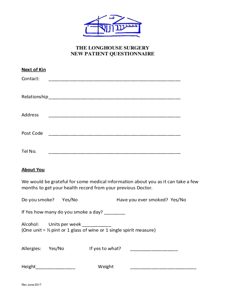 THE LONGHOUSE SURGERY NEW PATIENT QUESTIONNAIRE Next of Kin Contact:___Relationship ___Address___Post Code___Tel No.___About You, We would be grateful for some medical information about you as it