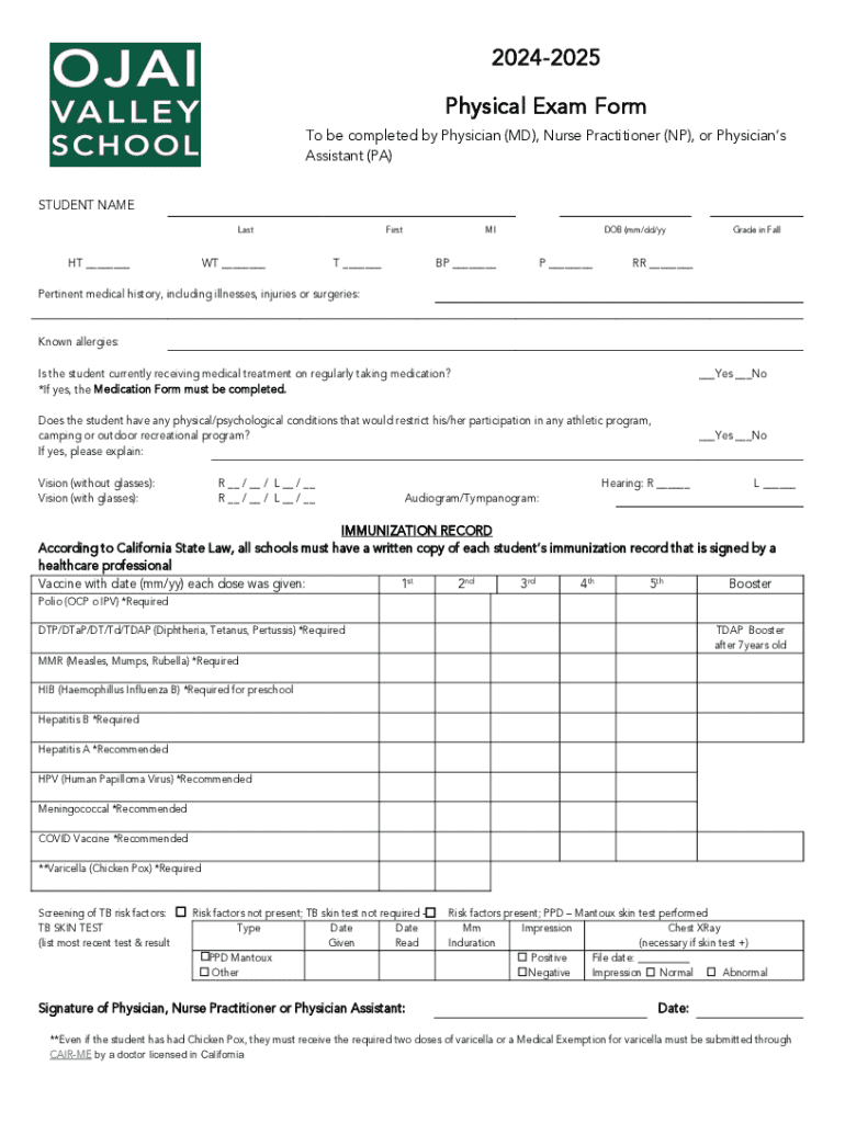 20242025 Physical Exam Form To be completed by Physician (MD), Nurse Practitioner (NP), or Physicians Assistant (PA) STUDENT NAME LastHT ___WT ___FirstMIT ___BP ___DOB (mm/dd/yyP ___Grade in FallRR