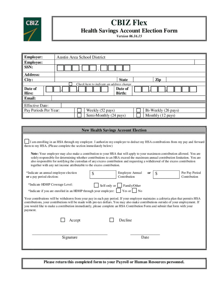 CBIZ Flex Health Savings Account Election Form Version 06.16.15Employer: Employee: SSN:Austin Area School District Address: City:StateZipCheck here to indicate an address changeDate of Hire: Email:/Date