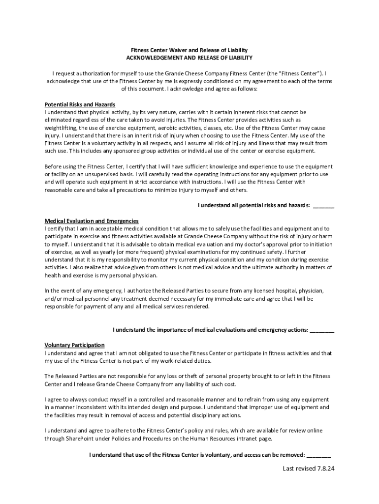 Fitness Center Waiver and Release of Liability ACKNOWLEDGEMENT AND RELEASE OF LIABILITY I request authorization for myself to use the Grande Cheese Company Fitness Center (the Fitness Center). I acknowledge
