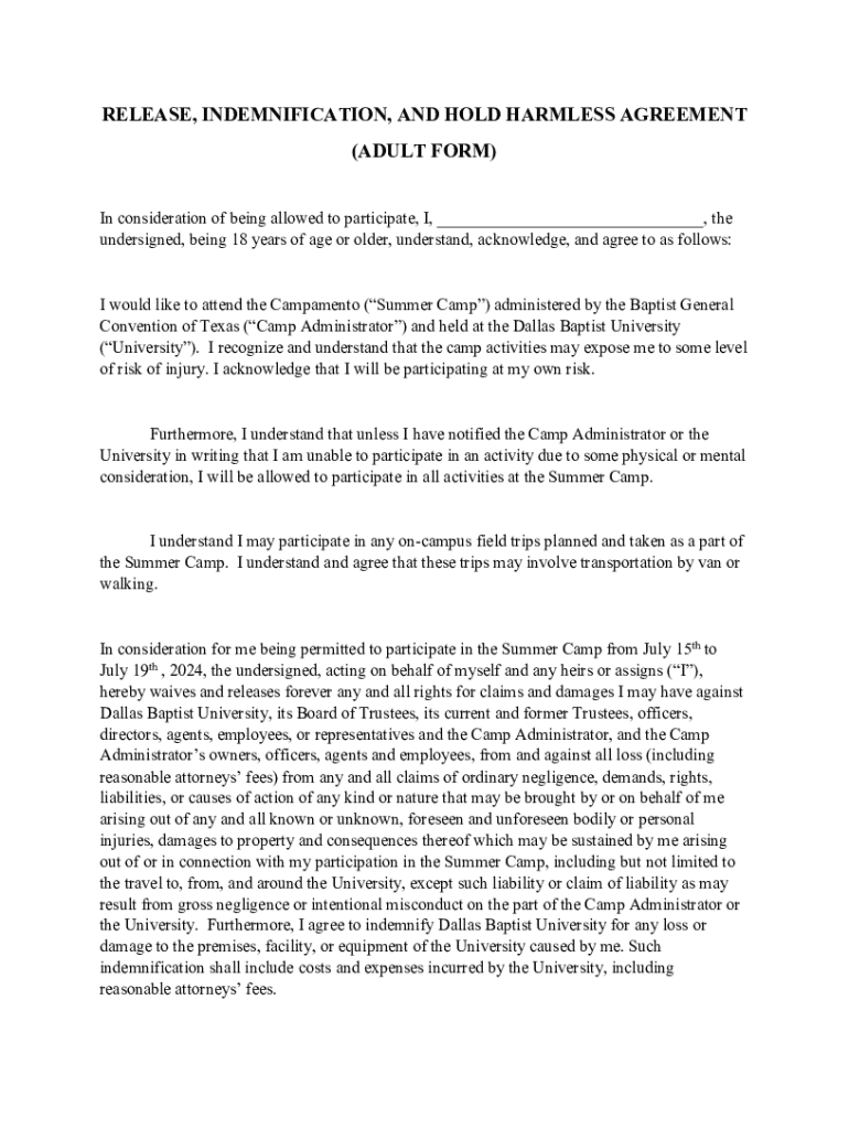 RELEASE, INDEMNIFICATION, AND HOLD HARMLESS AGREEMENT (ADULT FORM) In consideration of being allowed to participate, I, ___, the undersigned, being 18 years of age or older, understand, acknowledge,