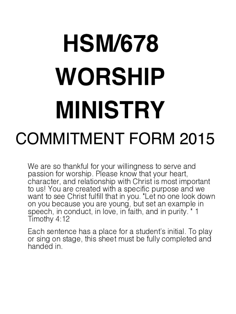 HSM/678 WORSHIP MINISTRY COMMITMENT FORM 2015 We are so thankful for your willingness to serve and passion for worship. Please know that your heart, character, and relationship with Christ is most
