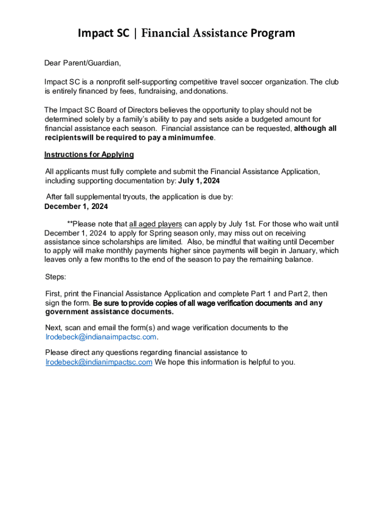 Impact SC | Financial Assistance Program Dear Parent/Guardian, Impact SC is a nonprofit selfsupporting competitive travel soccer organization. The club is entirely financed by fees, fundraising, and