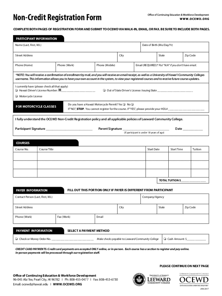 The non-credit registration form typically requires personal details such as name, address, contact information, course selection, and possibly payment information.