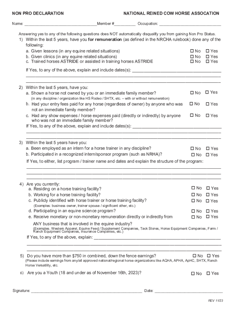 NON-PRO DECLARATIONNATIONAL REINED COW HORSE ASSOCATIONName: ___Member #___ Occupation: ___ Answering yes to any of the following questions does NOT automatically disqualify you from gaining Non-Pro