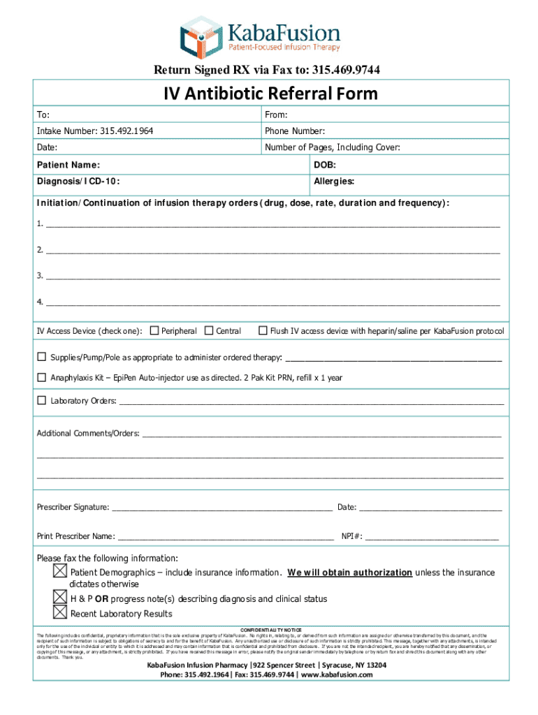 Return Signed RX via Fax to: 315.469.9744IV Antibiotic Referral Form To:From:Intake Number: 315.492.1964Phone Number:Date:Number of Pages, Including Cover:Patient Name:DOB:Diagnosis/ICD10:Allergies:Initiation/Continuation