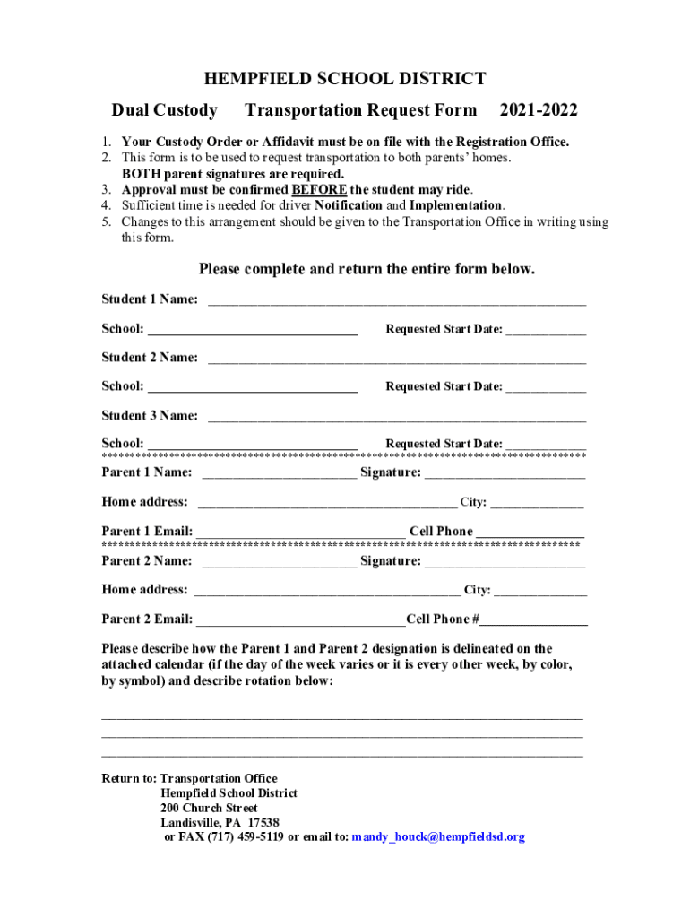 Dual CustodyTransportation Request Form202120221. Your Custody Order or Affidavit must be on file with the Registration Office.
