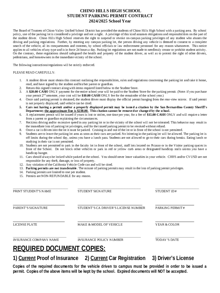 The The Board of Trustees of Chino Valley Unified School District has provided the students of Chino Hills High School with a parking area is a fillable form in MS Word extension that has to be completed and signed for specified reasons. Then, it is provided to the relevant addressee to provide specific details of any kinds. The completion and signing may be done in hard copy by hand or using an appropriate tool e. g. PDFfiller. These tools help to fill out any PDF or Word file without printing out. It also lets you edit its appearance according to the needs you have and put legit electronic signature. Once you're good, the user ought to send the The Board of Trustees of Chino Valley Unified School District has provided the students of Chino Hills High School with a parking area to the recipient or several of them by email and even fax. PDFfiller has got a feature and options that make your Word template printable. It provides a variety of settings for printing out. No matter, how you'll send a form after filling it out - in hard copy or electronically - it will always look well-designed and organized. To not to create a new writable document from scratch every time, make the original form into a template. Later, you will have an editable sample.