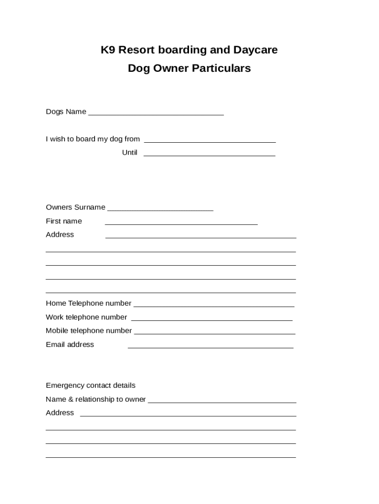 K9 Resort boarding and Daycare Dog Owner Particulars template instructions