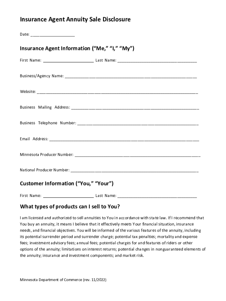 Get the free Insurance Agent Annuity Sale Disclosure Form - MN.gov