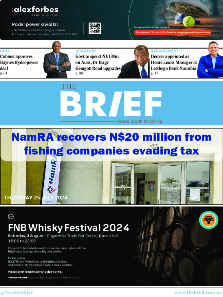 1The Brief ISSUE 701 JULY 25, 2024, Panel power awaits! For more information contact Panel Corporate League is here. Form your team, compete, and claim the title. Telephone: 081 444 827 Email: manager@namibiapadel.comDEALUPGRADESAPPOINTMENTp.