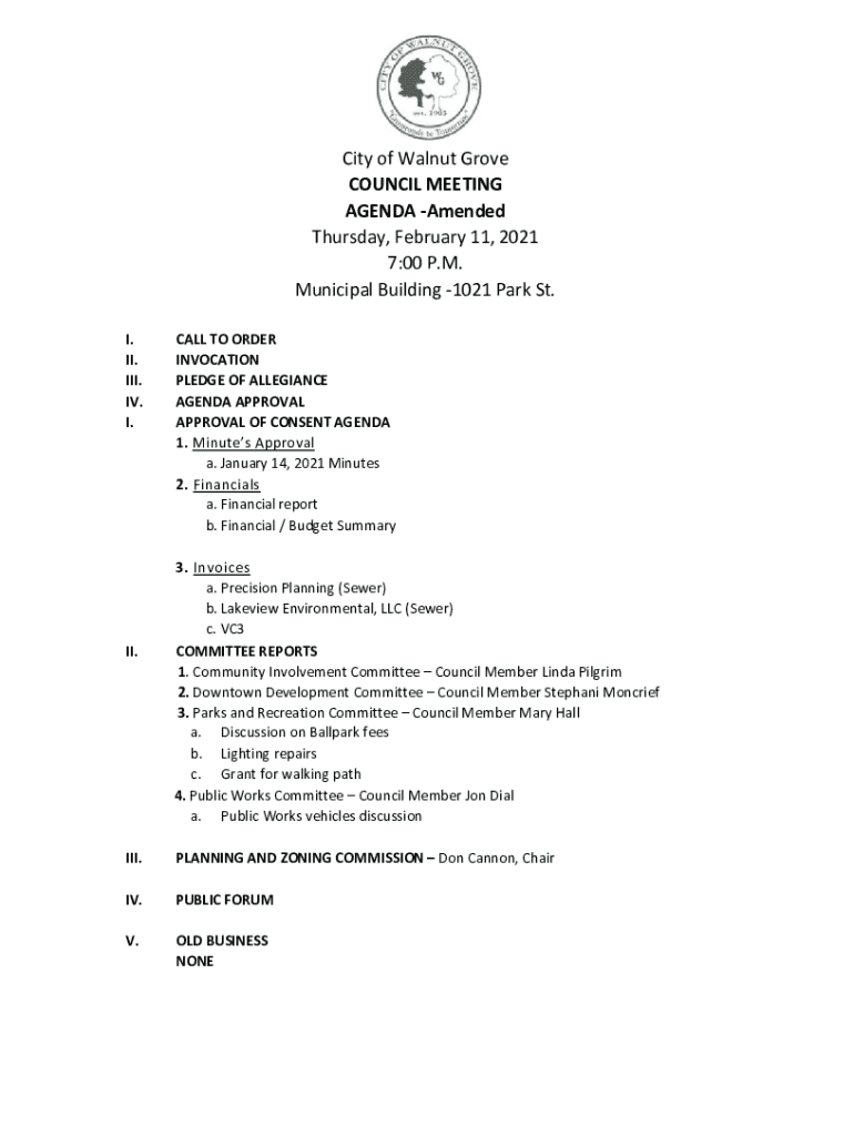 City of Walnut Grove COUNCIL MEETING AGENDA Amended Thursday, February 11, 2021 7:00 P.M. Municipal Building 1021 Park St. I. II. III. IV. I.II.CALL TO ORDER INVOCATION PLEDGE OF ALLEGIANCE AGENDA