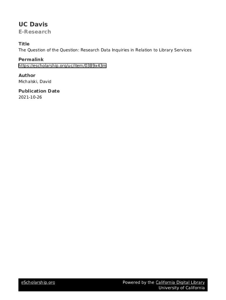 UC Davis Research Title The Question of the Question: Research Data Inquiries in Relation to Library ServicesPermalink https://escholarship.org/uc/item/0389×43mAuthor Michelson, DavidPublication