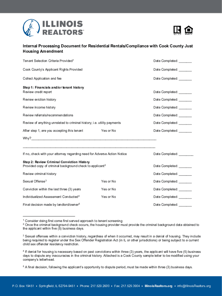 Internal Processing Document for Residential Rentals/Compliance with Cook County Just Housing Amendment Tenant Selection Criteria Provided 1Date Completed: ___Cook Counties Applicant Rights ProvidedDate