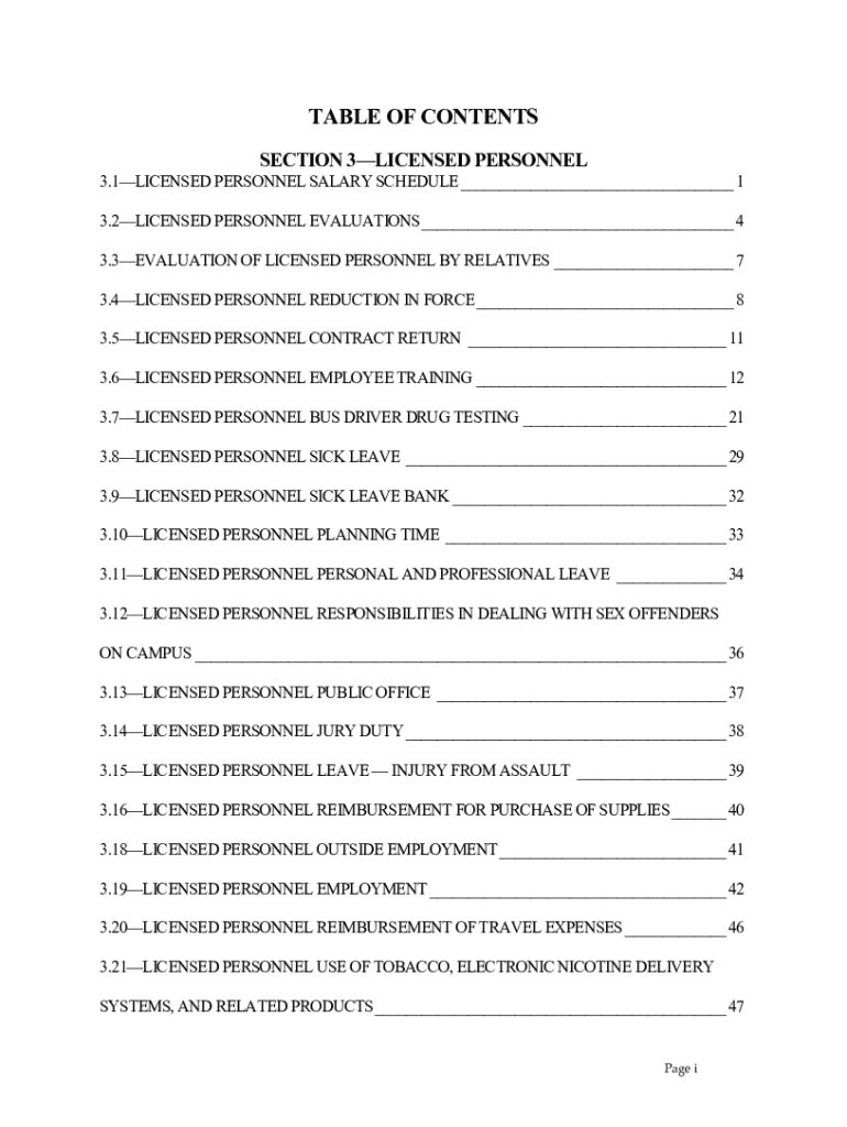 TABLE OF CONTENTS SECTION 3LICENSED PERSONNEL3.1LICENSED PERSONNEL SALARY SCHEDULE ___ 1 3.2LICENSED PERSONNEL EVALUATIONS ___ 4 3.3EVALUATION OF LICENSED PERSONNEL BY RELATIVES ___ 7 3.4LICENSED