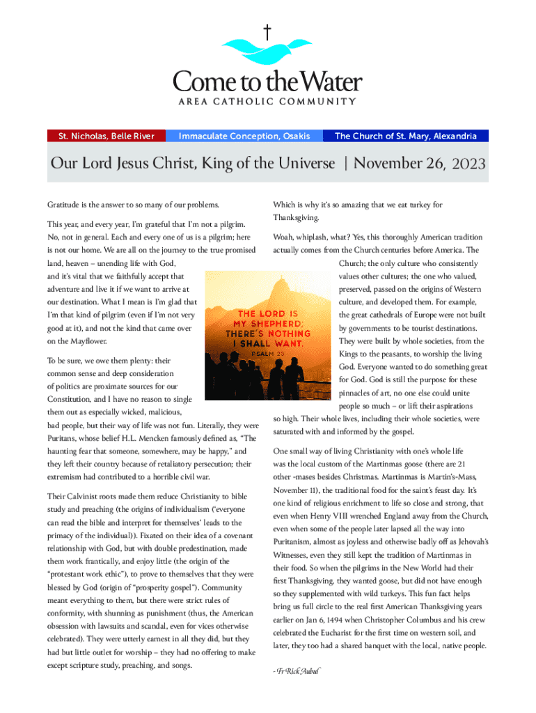 St. Nicholas, Belle RiverImmaculate Conception, OsakisThe Church of St. Mary, Alexandria Lord Jesus Christ, King of the Universe | November 26, 2023, Gratitude is the answer to so many of our problems.