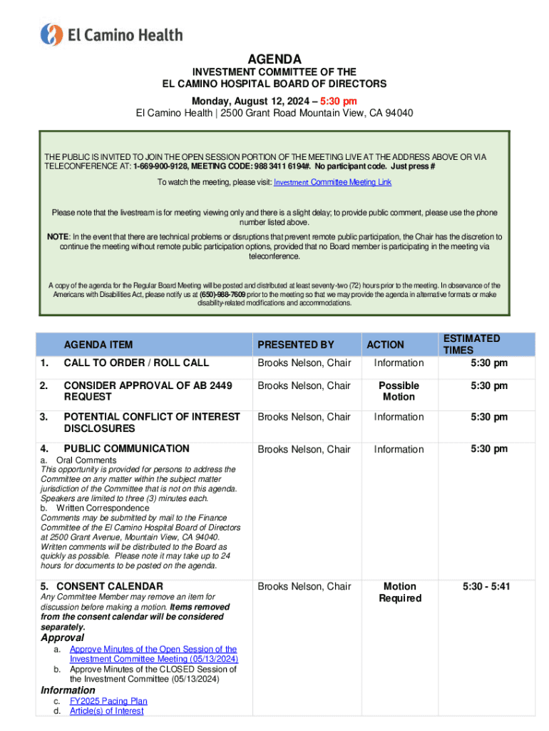 AGENDA INVESTMENT COMMITTEE OF THE EL CAMINO HOSPITAL BOARD OF DIRECTORS Monday, August 12, 2024 5:30 pm El Camino Health | 2500 Grant Road Mountain View, CA 94040THE PUBLIC IS INVITED TO JOIN THE