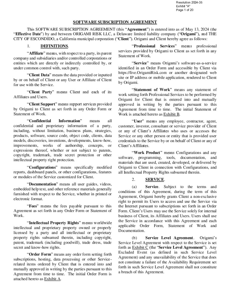 Resolution 202435 Exhibit \"A\" Page 1 of 20SOFTWARE SUBSCRIPTION AGREEMENT This SOFTWARE SUBSCRIPTION AGREEMENT (this Agreement) is entered into as of May 13, 2024 (the Effective Date) by and between