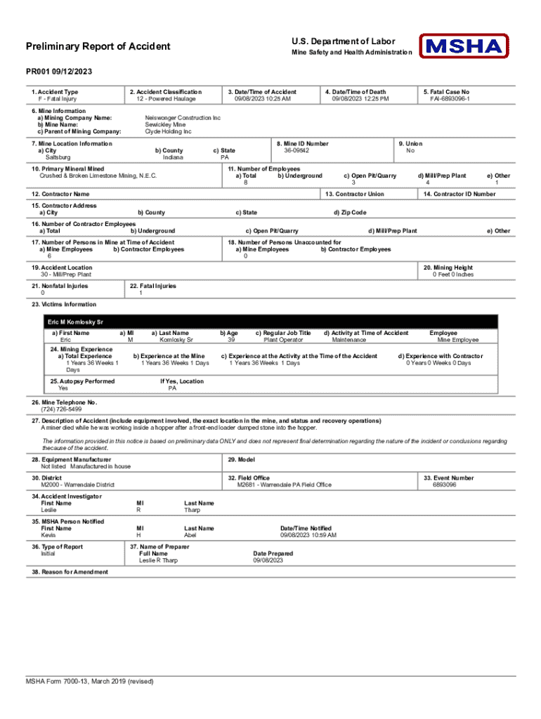 Get the free Fatal Accident Preliminary Report. Power Haulage Fatal Accident