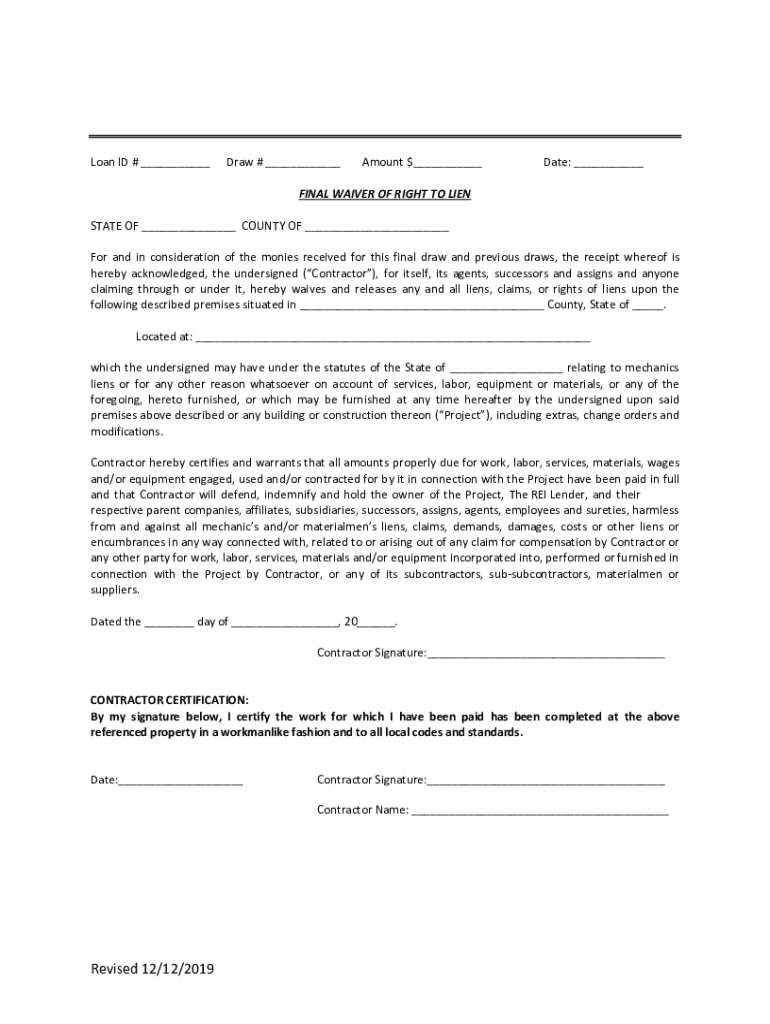Final waiver of right typically requires identification of parties involved, details of the dispute, and clear statement of rights being waived.