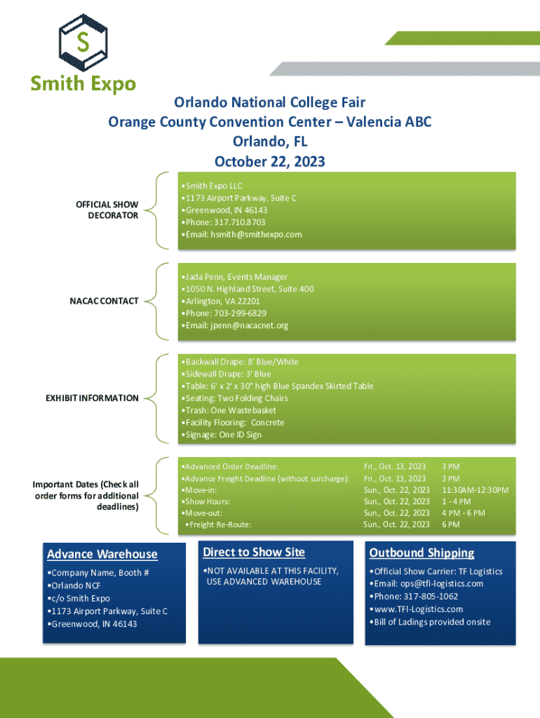 Orlando National College Fair Orange County Convention Center Valencia ABC Orlando, FL October 22, 2023, OFFICIAL SHOW DECORATORNACAC CONTACTEXHIBIT INFORMATIONImportant Dates (Check all order forms