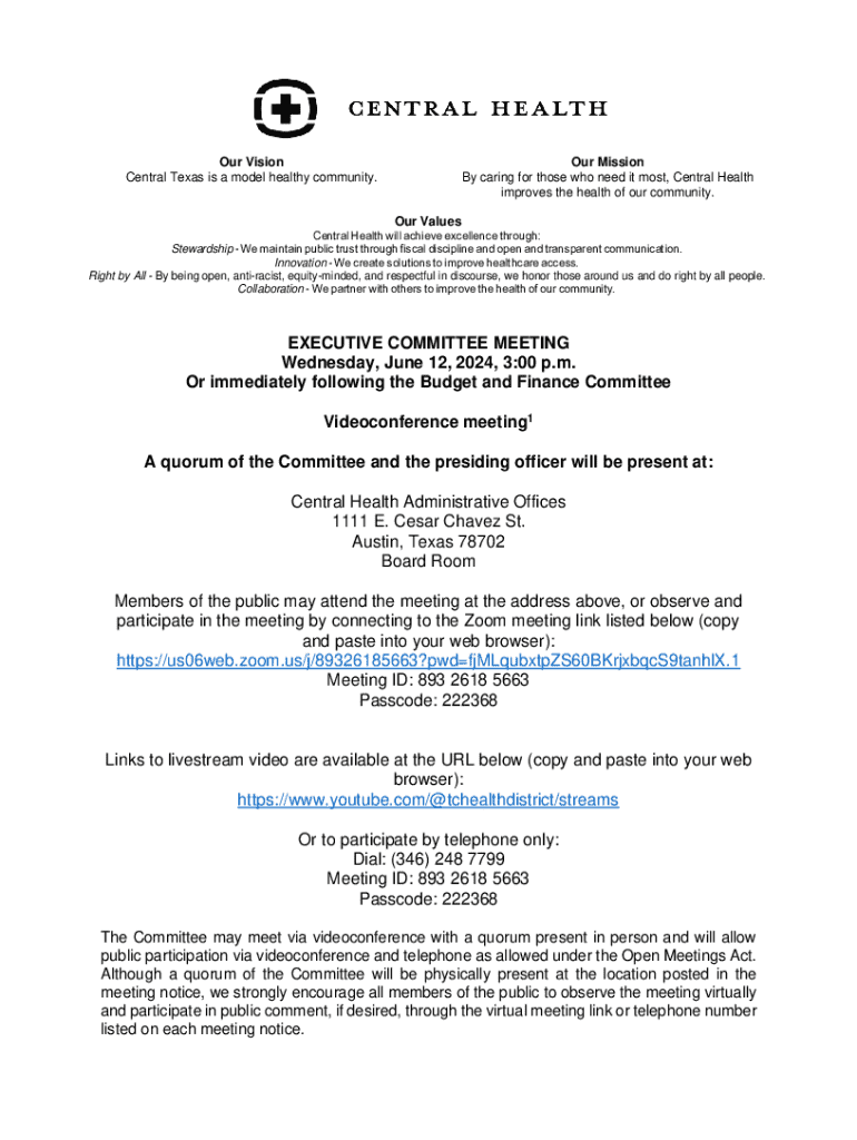 Our Vision Central Texas is a model healthy community. Our Mission By caring for those who need it most, Central Health improves the health of our community. Our Values Central Health will achieve