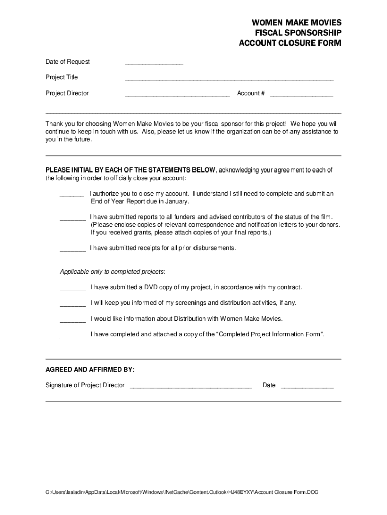WOMEN MAKE MOVIES FISCAL SPONSORSHIP ACCOUNT CLOSURE FORM Date of Request___Project Title___Project Director___Account # ___Thank you for choosing Women Make Movies to be your fiscal sponsor for this