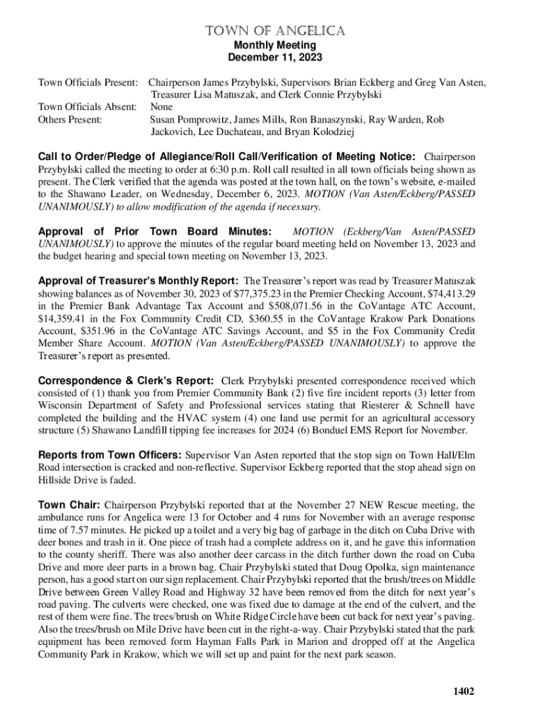 TOWN OF ANGELICA Monthly Meeting December 11, 2023 Town Officials Present: Town Officials Absent: Others Present:Chairperson James Przybylski, Supervisors Brian Eckberg and Greg Van Asten, Treasurer