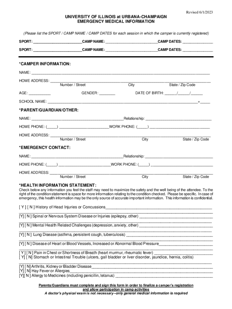 Revised 6/1/2023UNIVERSITY OF ILLINOIS at URBANACHAMPAIGN EMERGENCY MEDICAL INFORMATION (Please list the SPORT / CAMP NAME / CAMP DATES for each session in which the camper is currently registered)