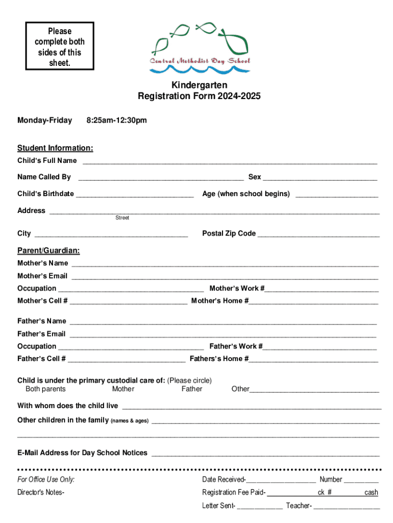 Please complete both sides of this sheet. Kindergarten Registration Form 20242025 MondayFriday8:25am12:30pm Student Information: Child's Full Name ___ Name Called By___ Sex ___Child's Birthdate ___Age