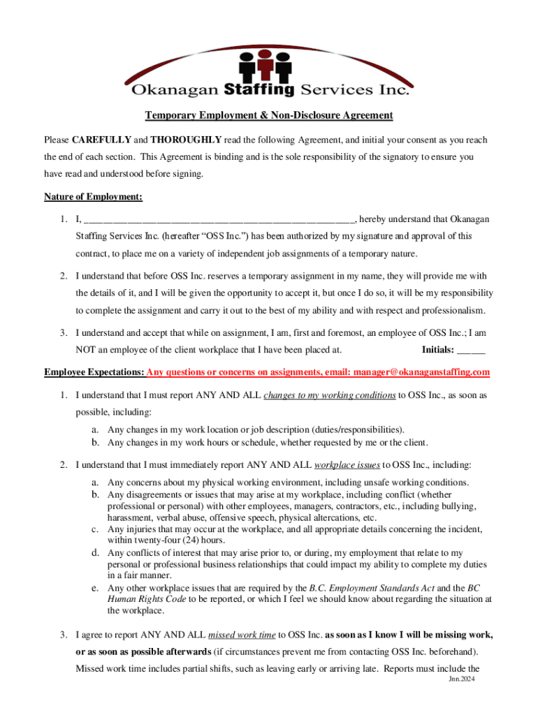 Temporary Employment & NonDisclosure Agreement Please CAREFULLY and THOROUGHLY read the following Agreement, and initial your consent as you reach the end of each section. This Agreement is binding