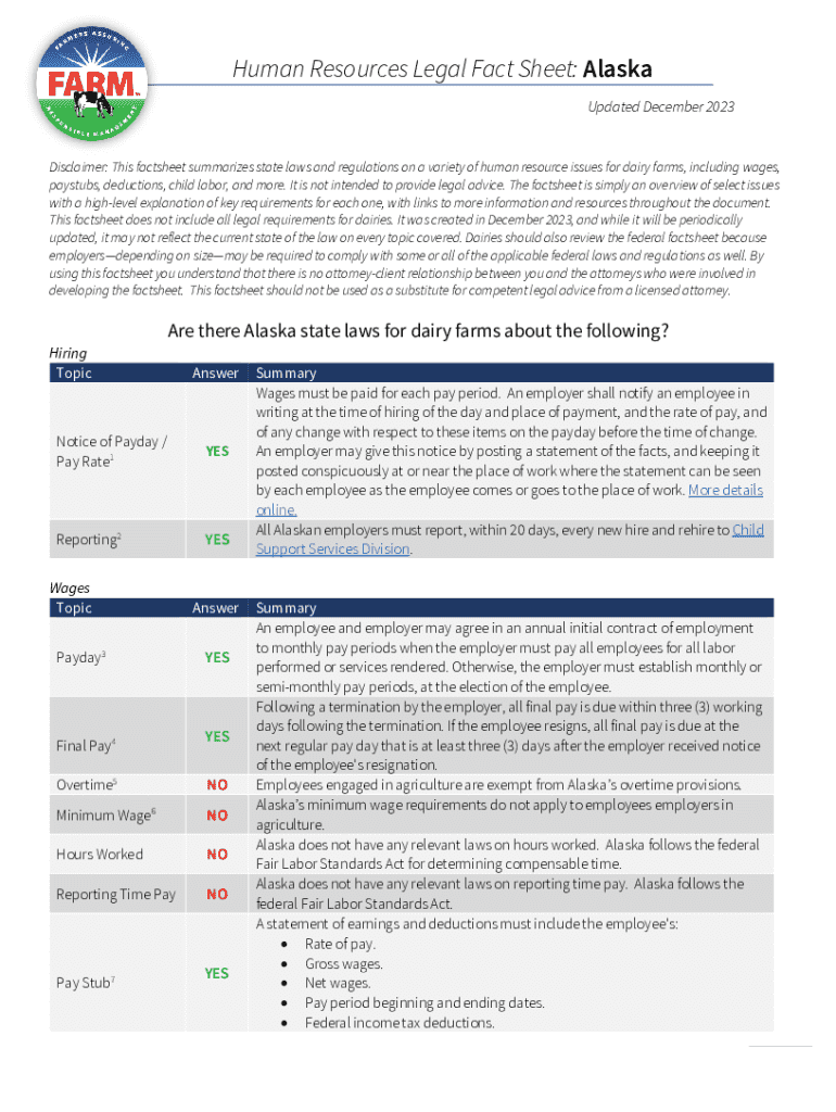 Human Resources Legal Fact Sheet: Alaska Updated December 2023Disclaimer: This factsheet summarizes state laws and regulations on a variety of human resource issues for dairy farms, including wages,