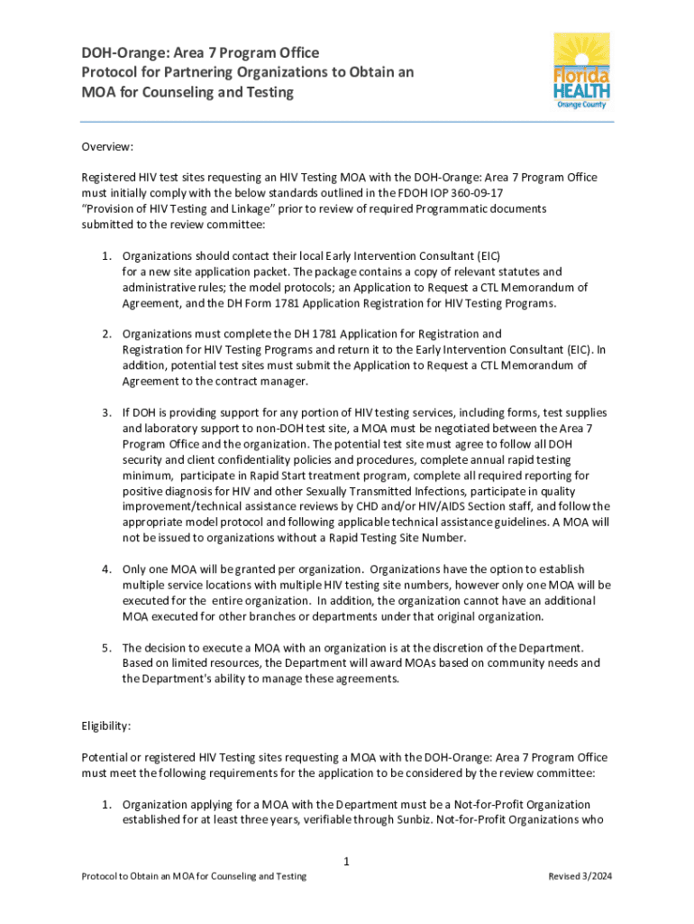 Downrange: Area 7 Program Office Protocol for Partnering Organizations to Obtain an MOA for Counseling and Testing Overview: Registered HIV test sites requesting an HIV Testing MOA with the Downrange: