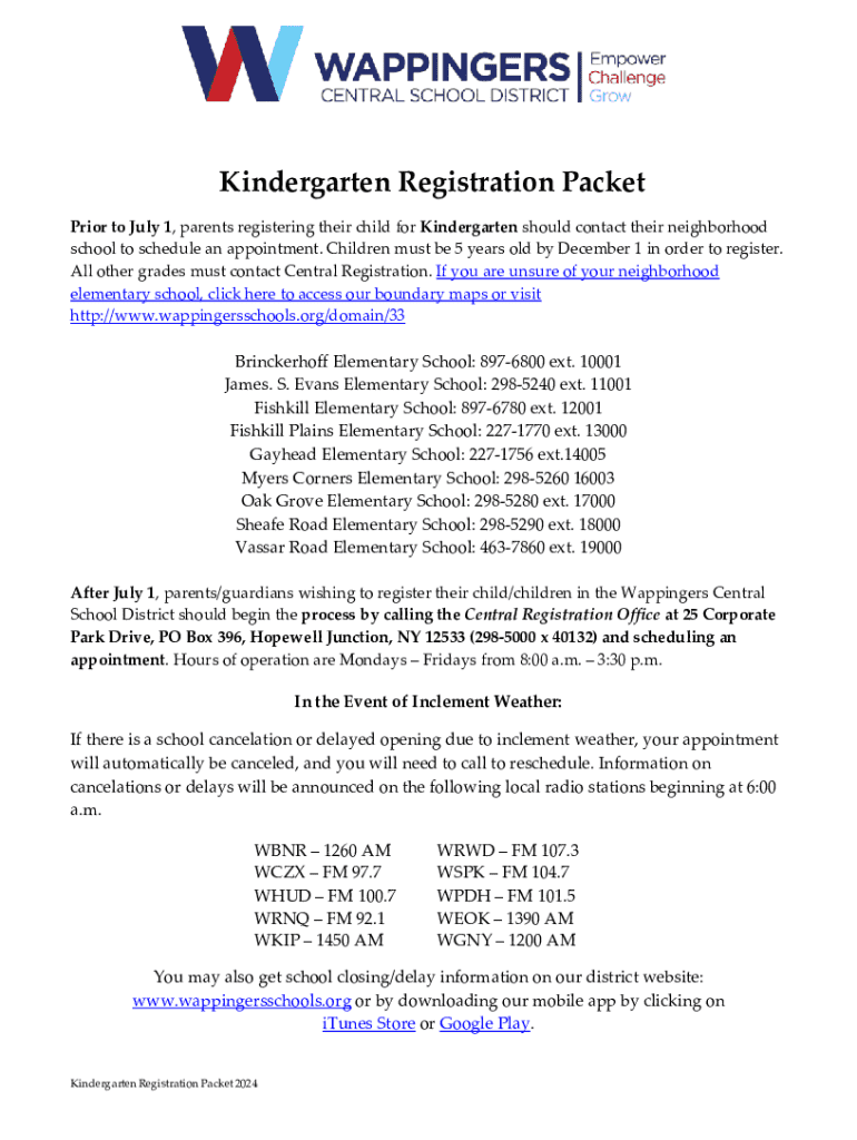 Kindergarten Registration Packet Prior to July 1, parents registering their child for Kindergarten should contact their neighborhood school to schedule an appointment. Children must be 5 years old
