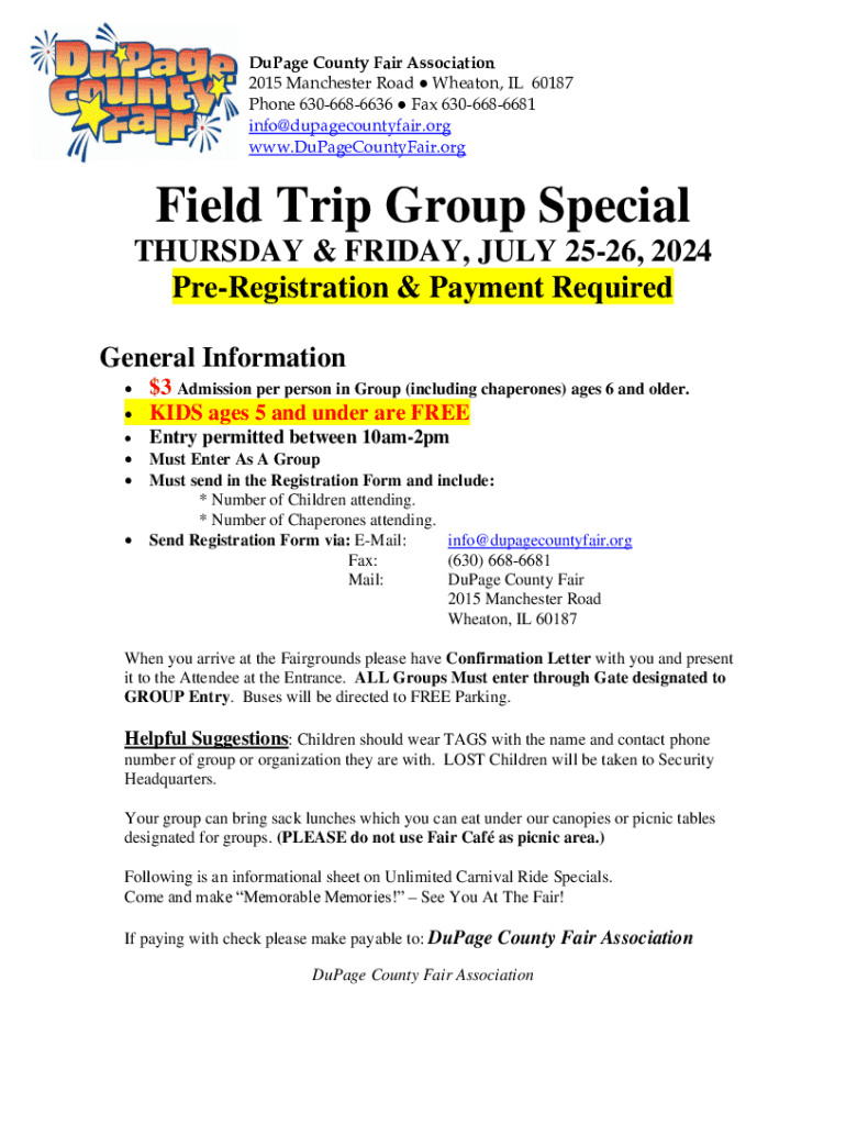 Register for the DuPage County Fair Field Trip Group events on July 25-26, 2024. Enjoy special admission rates and unlimited carnival rides for your group!