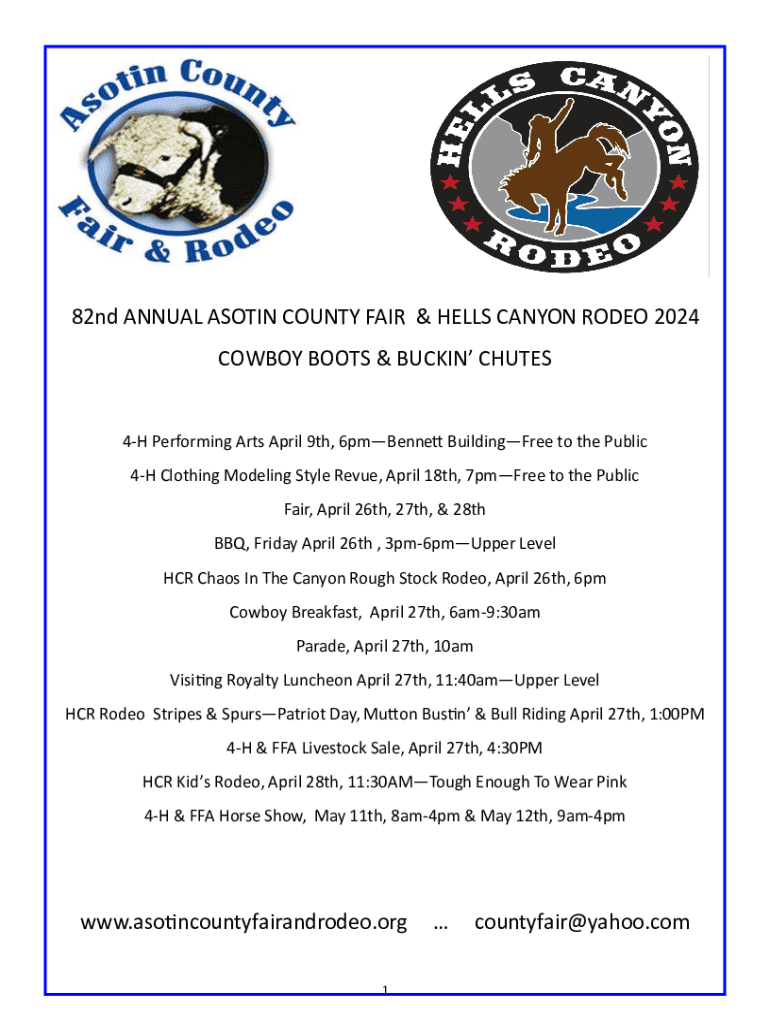 82nd ANNUAL ASOTIN COUNTY FAIR & HELLS CANYON RODEO 2024 COWBOY BOOTS & BUCKIN CHUTES4H Performing Arts April 9th, 6pmBennett BuildingFree to the Public 4H Clothing Modeling Style Revue, April 18th,