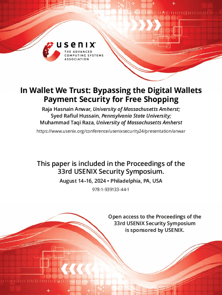 In Wallet We Trust: Bypassing the Digital Wallets Payment Security for Free Shopping Raja Hasnain Anwar, University of Massachusetts Amherst; Syed Rafiul Hussain, Pennsylvania State University; Muhammad