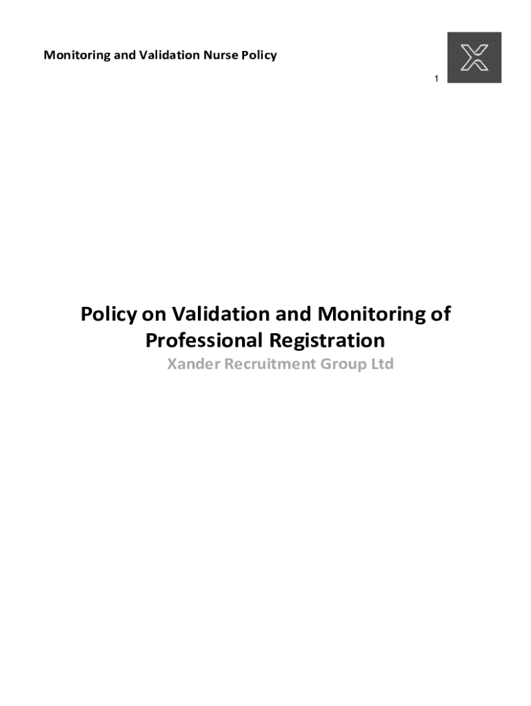 Monitoring and Validation Nurse Policy 1Policy on Validation and Monitoring of Professional Registration Xander Recruitment Group LtdMonitoring and Validation Nurse Policy 2ContentsSectionPage1.0Introduction32.0Aims33.0Policy
